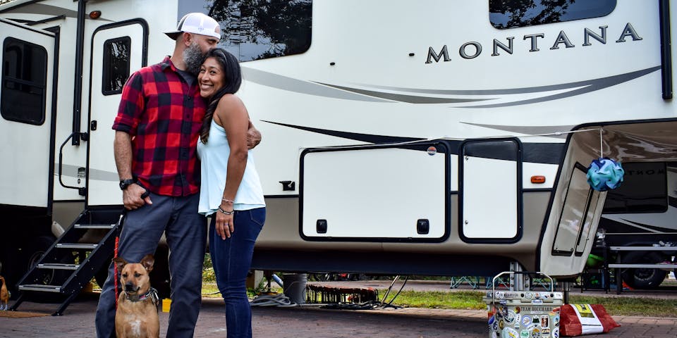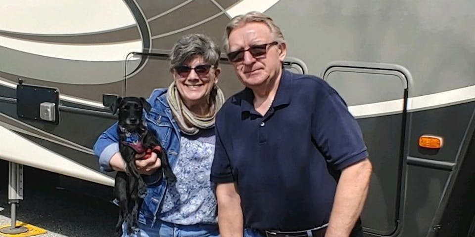 Retired Air Force veterans with combined 42 years of service, let us introduce you to Bob and Grace! Growing up in different states on the opposite ends of the state spectrums — southern California to upstate New York, they have been together traveling in their Montana for over 3 years. Not sure where to call home, they followed their passion for travel. After watching a commercial of a dog running down the steps of an RV they were hooked! Bob and Grace continue to give back to others, they volunteer within the communities they visit, from local veteran organizations to local animal rescues. You may see them out walking dogs several times a week!