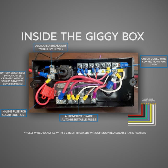 Based on customer input, Keystone Innovation Lab's Giggy Box was developed to organize and centralize an RV's 12V wiring connections. When appropriately equipped, it also allows owners turn off all 12V power to the RV—eliminating parasitic draw that can cause dead batteries. While the battery disconnect cuts power to 12V components, it maintains power to the breakaway switch for safety. If the RV has a solar power system, the batteries will still be charged when the disconnect is in the OFF position.