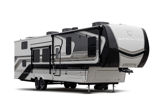 Sprinter is your step up to full-sized, affordable fifth wheel RV travel with its legendary Camping Made Easy™ spirit and a price point that will make you smile. Built on a 100" wide-body frame and featuring a full-profile upper deck, the models deliver more living space, more storage, and more towing stability. Like Sprinter Limited, Sprinter models offer turnkey amenities like KeyTV™, SolarFlex™ packages, and an iN-Command® Lite control system. Owners will also appreciate unexpected touches like deeper drawers, storage compartments with motion lighting, and rear ladders to fully walkable roofs.