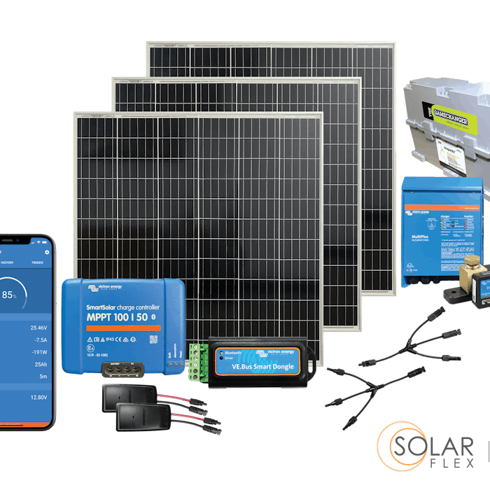 Step up to energy independence with SolarFlex Outlast 660i-L. This system includes a best-in-class Dragonfly Energy® Lithium-ion battery and a soft-start air conditioner that is compatible for use with solar power. Owners can run multiple 110v appliances simultaneously—making it ideal for remote workers, gamers, and families. With the hybrid inverter/charger and a Lithium ion battery, users will enjoy ultra-fast recharge times when it’s necessary to connect to shore power to top off the battery bank. Advanced monitoring provides full visibility of energy collection and usage to maximize your time off-grid.